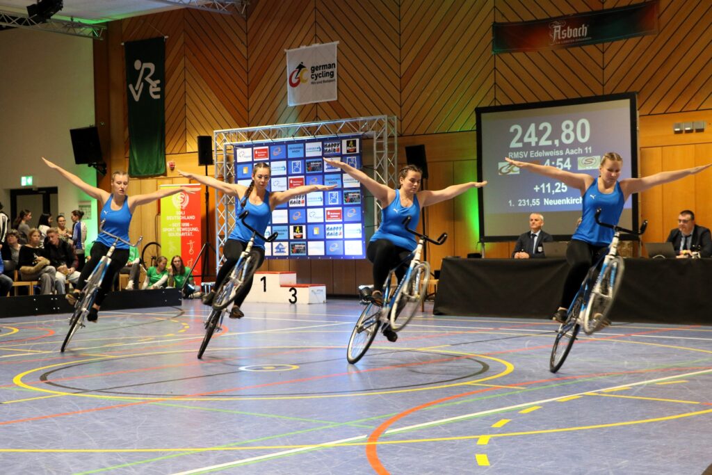 Wie erwartet qualifizierte sich das Quartett des RV Mainz-Ebersheim bereits in der Vorrunde mit 241,65 vorzeitig erneut für die WM. Die Europameisterinnen zeigten eine perfekte Kür und liesen der Konkurrenz keine Chance. Mit einem lauten «Jaaaa» quittierte RVE-Trainer Oliver Schwarz diese Leistung seines Vierers, die das WM-Ticket bedeutete. Neuenkirchen (228,13), die beiden Aacher Teams (227,42 bzw. 227,18) sowie Steinhöring hatten das Nachsehen. Während die beiden Mannschaften der offenen Klasse in die Zwischenrunde mussten, war im Finale reine «Frauen-Power» angesagt. In der Zwischenrunde fuhr Aach mit Lena Andorinha, Rebecca Grote, Jone Burow und Yannick Gaißer gegenüber der Vorrunde deutlich ruhiger und auch die Drehungen passten, sodass sie zufrieden und strahlend nach der 5-minütigen Kür von ihrem Kunstrad steigen konnten. Die 237,41 bedeutete neuen Deutschem Rekord im 4er offen. Steinhöring hatte kurz vorher 223,16 vorgelegt. Im Finale wurden die Karten neu gemischt. In der eigenen Halle musste sich das Ebersheimer Quartett aufgrund eines Absteigers beim angefahrenen Außenring dem RMSV Aach geschlagen geben. Trotzdem quittierte das Publikum die ausgefahren 232,25 mit großem Applaus. Die tolle Stimmung in der Halle steckte wohl auch den Aacher 4er an. Alina Bötzer, Franziska Bötzer, Carolin Schmid, Sabrina Bürßner konnten ohne Druck ihre Übungen absolvieren. Es passte deutlich besser als einige Stunden zuvor. Und es gelang es den Vieren die eigene Bestleistung auf 240,74 zu erhöhen. Diesen konnte Ebersheim anschließend nicht mehr toppen- Somit konnten die vier ihren ersten Finalsieg feiern. Neuenkirchen folgte den beiden Teams mit 231,55 auf Platz 3.). «Beide Mannschaften konnten im Finale ihr vorhandenes Können abrufen, was wir Trainer uns gerne 2 Wochen früher gewünscht hätten, dann wäre es in der WM-Qualifikation sicherlich enger geworden», so Aachs Cheftrainerin Katja Gaißer. «Es ist natürlich top, wenn gleich zwei Mannschaften auf diesem hohen Niveau eine neue persönliche Bestleistung erzielen. Jetzt geht der Blick Richtung Hallenrad-DM, wo die Sportler hoffentlich diese Leistung nochmals abrufen können. Wir sind auf alle Fälle sehr stolz auf das, was die Sportler in den letzten Wochen geleistet haben.»