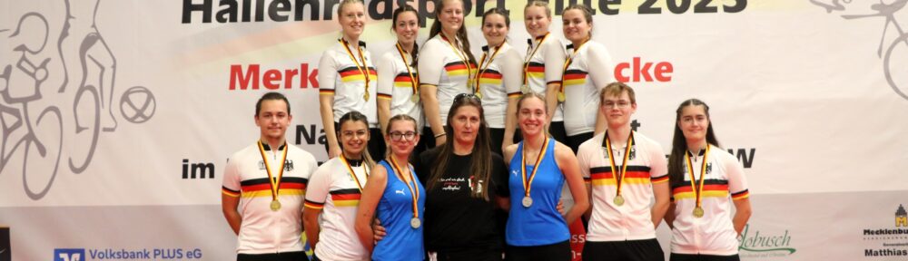 Den ersten deutschen Meistertitel des Jahres 2025 in der Eliteklasse bei der Hallenrad-DM ging an den RV Mainz-Ebersheim. Sie holten sich den Meistertitel souverän mit 214,59 Punkten. Damit holten sie sich den DM-Titel, den sie bereits 2023 errangen, wieder zurück nach Ebersheim . Das junge 6er Team des RMSV Aach mit Yannick Gaißer, Jone Burow, Lena Andorinha, Rebecca Grote, Anica Meßmer und Hannah Elsässer fuhr in ihrem ersten Elitejahr mit einer perfekten Kür zu 195,55 und damit auf Platz 2 vor, während die Titelverteidigerinnen vom RMSV Aach Alina Bötzer, Carolin Schmid, Franziska Bötzer, Natalie Grote, Sarah Bötzer und Sabrina Bötzer nach einem Patzer sich neuformieren mussten, dadurch viel Zeit verloren und so am Ende mit 158,02 und mit Platz 3 zufrieden sein mussten. „So ein Patzer kannst Du in unserer Sportart, im Gegensatz zu anderen Sportarten nicht mehr aufholen“, so Aachs Cheftrainerin Katja Gaißer. „Um zu gewinnen, musst du innerhalb der 5 Minuten alles perfekt zeigen.“