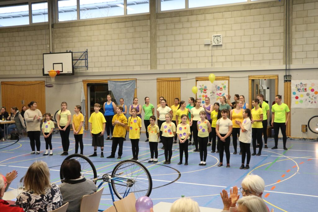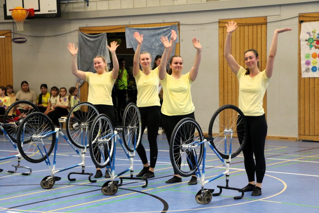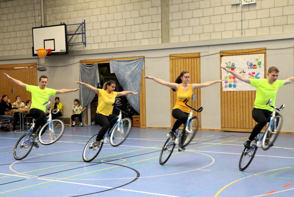 Hallenradsport (WS) Zur alljährlichen Kunst- und Einrad Show hatte der RMSV Edelweiss Aach am Sonntag in die nicht ganz vollbesetzte Aacher Schulsporthalle eingeladen. Diesmal unter dem Motto „Alles steht Kopf“ oder nach den Originaltitel „Inside Outside“ für das „Innere nach außen gekehrt“, nach dem US-amerikanische Animationsfilm von Pixar, der 2015 in Cannes seine Premiere feierte. Die Geschichte, bezogen auf den RMSV Aach begann wie folgt: Stellt Euch einen Zug vor – nicht irgendeinen Zug, sondern der Erinnerungszug. In diesem Zug sitz heute Lina. Lina ist 30 Jahre alt und fährt seit ihrem 6. Lebensjahr Einrad und Kunstrad. In diesen vielen Jahren hat sie beim RMSV Aach schon einiges erlebt. Sie schaut aus ihrem Fenster und reist durch die Vergangenheit. Neben ihr schwebten viele bunte Kugeln – Erinnerungskugeln. Jede Kugel leuchtet in einer anderen Farbe. Es sind Kernerinnerungen. Jede Farbe wurde von den Kindern auf ihren Einrädern vorgestellt. Gelb für freudige Erinnerungen, Lila für ängstliche Momente, Türkis für Neid, Blau für Kummer, Dunkelblau für Langeweile, Rot für wütende Gefühle, Grün für Ekel, Orange für Zweifel und rosa für peinliche Momente. Die wichtigen Kugeln schwebten in ihrem Köpfchen – im Langezeitgedächtnis. Das erste Mal auf dem Einrad. Der erste Wettkampf der mit Freude und Stolz gemeistert wurde, der aufregendste Tag, als die Fahrt zu einem Wettkampf an eine Badische Meisterschaft gleich 2 Stunden ging und dann strahlend die ersten Medaillen umgehängt wurden. Aber auch Kummer und Leid, wenn die Übungen nicht klappte und viele Stürze verursachten und der Umstieg auf größere Räder alles kompliziert machten. Der Traum von der ersten Teilnahme an der Deutschen Meisterschaft, der lang ersehnte Deutsche Meistertitel. Und langsam entstehen die Insel, der Freundschaft, weil sie mit anderen Kindern trainiert, die Spaßinsel, weil sie lacht , Quatsch macht und neue Übungen ausprobiert oder die Zusammenhaltinsel, denn Kunst- und Einrad ist nicht nur Sport, sondern ein Team. Aber auch Insel des Schmerzens, denn wer oft trainiert, kennt Stürze, blaue Flecken und auch Tränen.