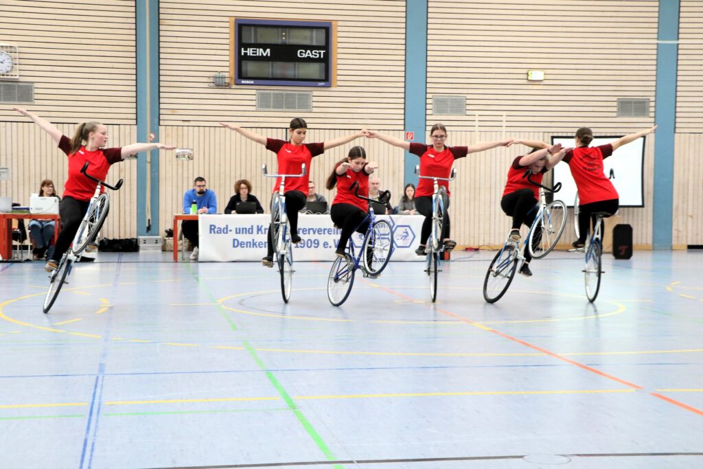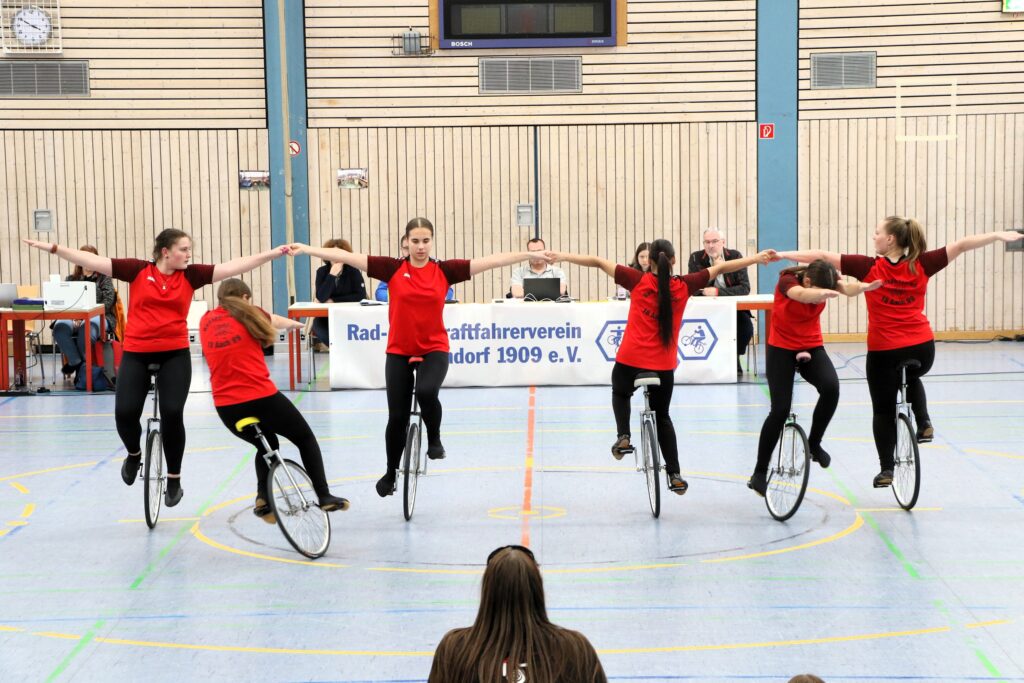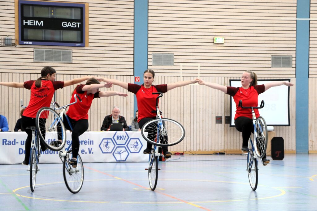 Kunstrad-/Einradsport (WS) Im württembergischen Denkendorf fand am Sonntag, 01.03.2026 die Baden-Württembergischen Meisterschaft der Junioren im Kunst- und Einradsport statt. Neben den Titelehren ging es auch um die Qualifikation für die DM-Halbfinals, das heißt: Die vorgegebenen Qualifiaktionspunktzahlen zu übertreffen. Aus der Radsport-Region Hegau-Bodensee war der RMSV Aach mit 4 Mannschaften und der RMSV Nenzingen mit einem Team vertreten. Alle sollten sich für den Junior-Mannschafts-Cup, dem DM-Halbfinale der Mannschaften, am 21.03.2026 in Oberaußem-Bergheim(NRW) qualifizieren. Aach fuhr bei vier Starts zu 2 BaWü-Meister sowie je einmal auf Platz 2 und 3. Der Nenzinger 4er holte sich BaWü-Silber.