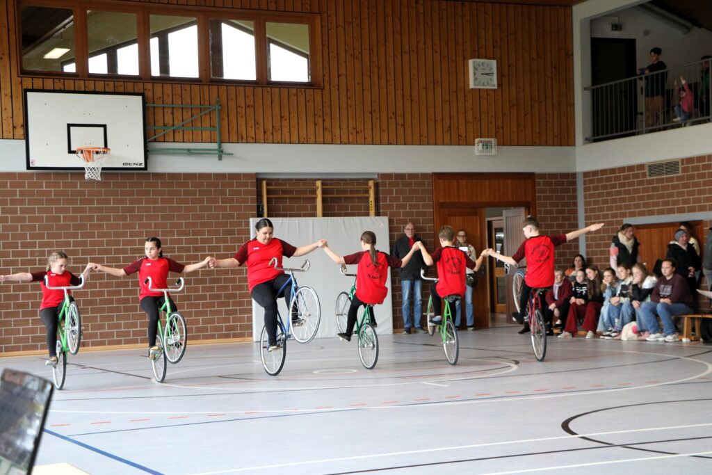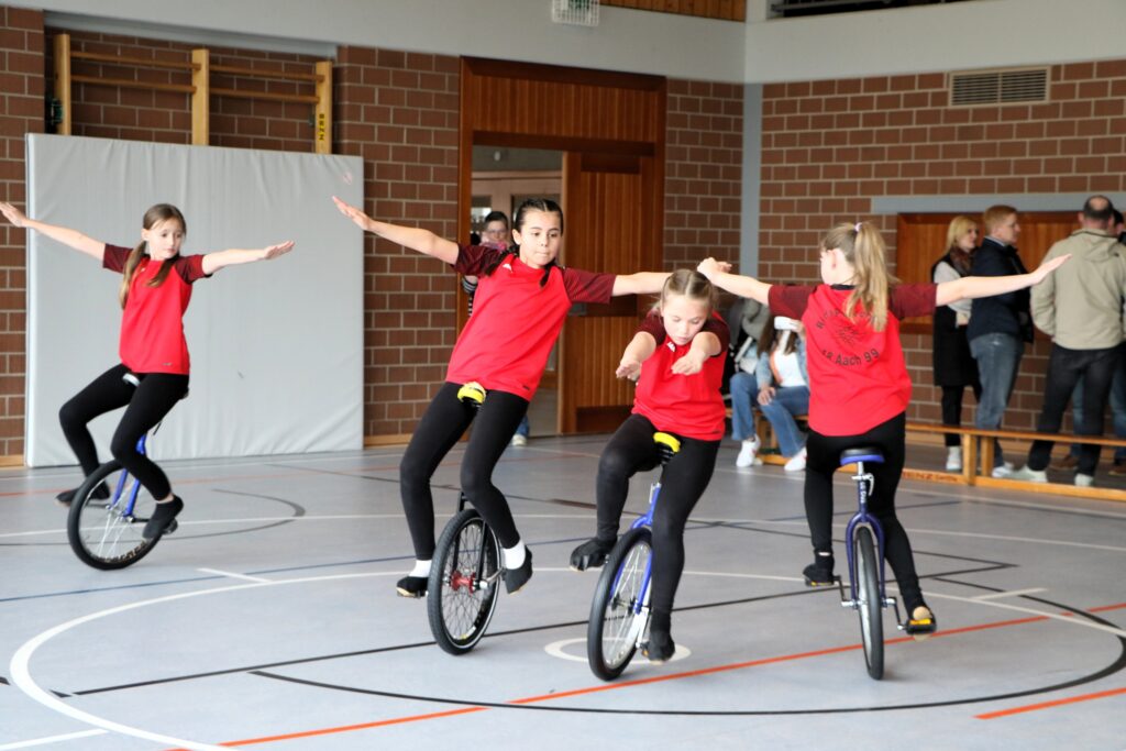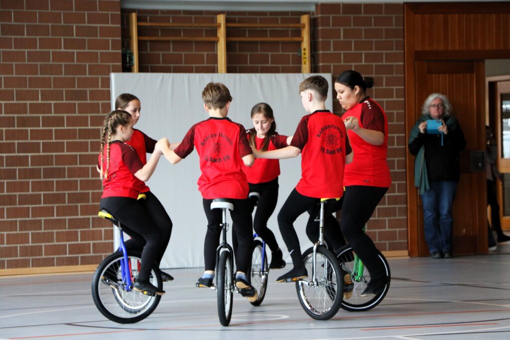 Mit einer starken Leistung von 79,95 waren Lotta Leitz / Amelie Biedermann / Helena Schroth / Lucina Quni vom RMSV Aach im 4er Einrad der Schülerinnen nicht zu schlagen. Dahinter folgte Volkertshausen mit 47,08 und das erstmals gestartete Team aus Orsingen. Im 4er Einrad der offen Klasse übertrafen Haylie Rietschle / Mara Moll / Lennon Keller / Landelin Lürig (Aach) mit 103,79 gleich die 100er Marke gefolgt von einem weiteren Aacher Quartett, die 17,42 ausfuhren. Auch im 6er Einrad konnten Basandra Mirzai / Mara Moll / Lennon Keller / Landelin Lürig / Amelie Biedermann / Helena Schroth mit 88,0 überzeugen. Gleich bei der Premiere löste der 6er Kunstrad mit Basandra Mirzai / Mara Moll / Lennon Keller / Landelin Lürig / Amelie Biedermann / Lucina Quni und ausgefahren 61,57 Punkten das Ticket zur Badischen.