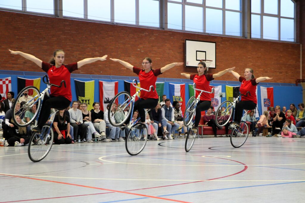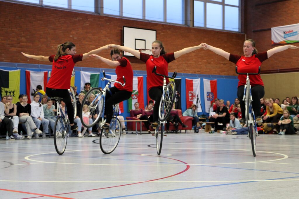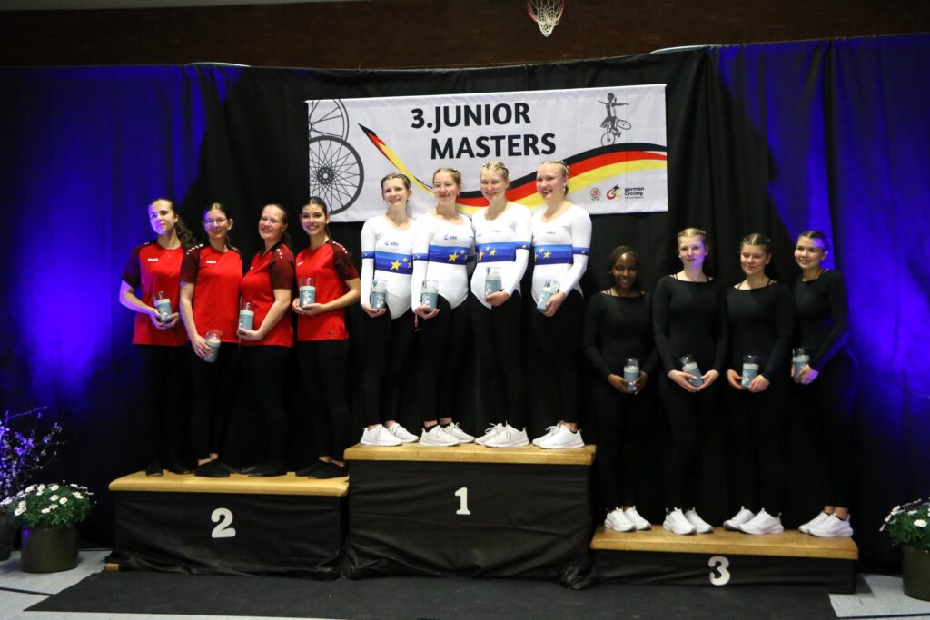 Hallenradsport (WS) Viel der Junioren Sportler/innen hatten mit ihren Betreuer- und Fanteams eine lange Anreise in den Hohen Norden aus dem Süden Deutschlands auf dem Weg zum 3. Junior Masters (Finale) am Wochenende zurückzulegen. In Neuenkirchen / Schwanewede (bei Bremen) fand dieser Wettkampf statt, wo der RV Neuenkirchen in hervorragender Weise diesen ausrichtet. „Wir haben hier erneut hervorragende Bedingungen vorgefunden“, so GC-Kunstrad-Koordinator Kurt-Jürgen Daum und RKB-Vertretet Ralph van Züpthen bei der Übergabe des Gastgeschenks. „Ihr habt uns hier einen perfekten Rahmen geboten, sodass wir aus dem Süden gerne hierherkommen. Bereits Ende August sind wir hier wieder Gast, wenn der Bundes-Pokal im Einrad stattfinden wird.“ In den 1er + 2er Disziplinen stand nach Ludwigsburg und Nufringen die 5. + 6. Qualifikation um die deutschen Startplätze für die Junioren-Europameisterschaft in Höchst / Österreich und das DM-Halbfinale für die Junioren-DM in Moers / NRW auf der Agenda, wo die limitierten DM-Startplätze ausgefahren wurden. Für die 4er Mannschaften nach dem Junior-Mannschafts-Cup in Bergheim die 3. + 4. EM-Qualifikation. Junioren-Bundestrainer Florian Blab (Hörbranz) stellte am Ende das TEAM-D für die Junioren-EM einzeln vor. Dieser Vorschlag muss jedoch noch vom German Cycling Präsidium bestätigt werden. Das junge 4er Team des RMSV Aach mit Anika Meßmer, Emelie Lehmann, Mayla Rietschle und Saskia Grote für in beiden EM-Entscheidungen auf Platz 2. In der EM-Gesamtwertung (von 4 Wertungen zählen die 3 Besten) platzierten sie sich hinter dem RSV Ebnat (592,04) mit 527,45 auf Platz 2 und ist damit das EM-Ersatzteam. Dahinter folgen die Nationalkader Teams aus Schwanewede (484,36) und Denkendorf (465,78).