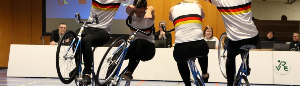 Riesenjubel herrschte dann zum Schluß in der Töngeshalle bei der Entscheidung im 4er Kunstrad. Der 4er des gastgebenden RV MZ-Ebersheim hat nicht nur das EM-Ticket gelöst, sondern auch eine bisher nie im 4er erreichte Punktzahl von 249,95 im Finale ausgefahren. Kein Weltrekord, da das Kampfgereicht nicht international besetzt war, aber sicherlich ein neuer Deutscher Rekord. Der RMSV Aach mit Franziska Bötzer, Lena Andorinha, Jone Burow und Yannick Gaißer hatten zu vor starke 239,81 vorgelegt und damit das Eberheimer Quartett zu einer neuen Bestleistung getrieben.