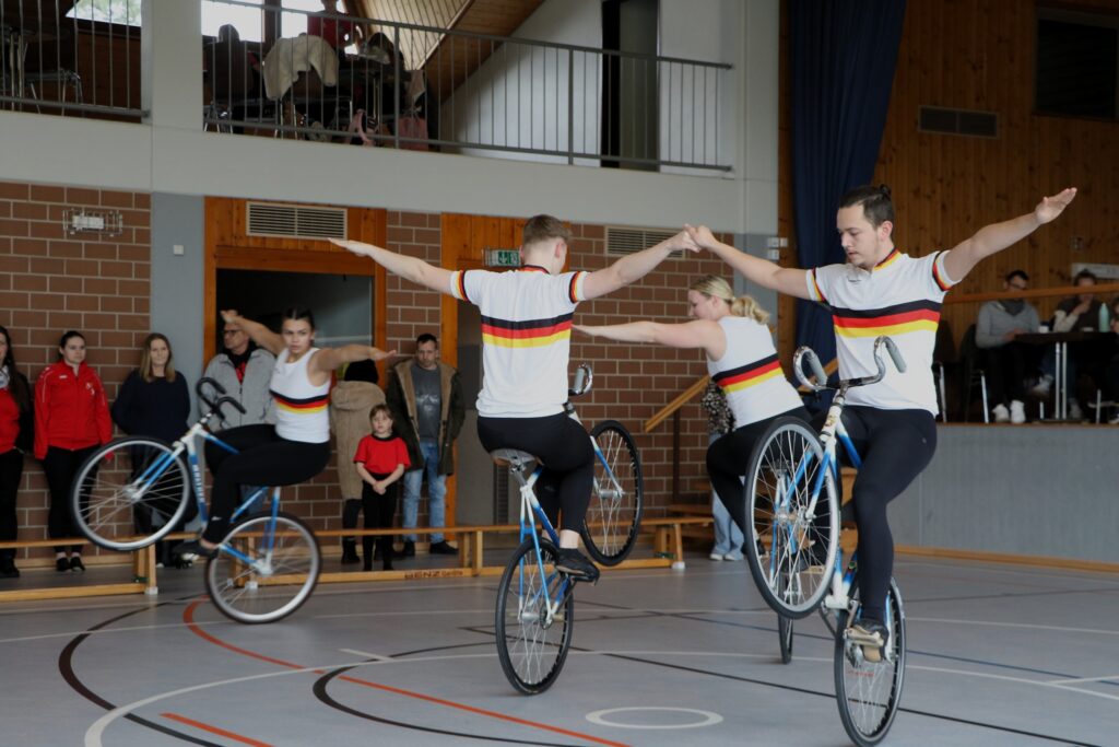 Mit einer starken Leistung von 79,95 waren Lotta Leitz / Amelie Biedermann / Helena Schroth / Lucina Quni vom RMSV Aach im 4er Einrad der Schülerinnen nicht zu schlagen. Dahinter folgte Volkertshausen mit 47,08 und das erstmals gestartete Team aus Orsingen. Im 4er Einrad der offen Klasse übertrafen Haylie Rietschle / Mara Moll / Lennon Keller / Landelin Lürig (Aach) mit 103,79 gleich die 100er Marke gefolgt von einem weiteren Aacher Quartett, die 17,42 ausfuhren. Auch im 6er Einrad konnten Basandra Mirzai / Mara Moll / Lennon Keller / Landelin Lürig / Amelie Biedermann / Helena Schroth mit 88,0 überzeugen. Gleich bei der Premiere löste der 6er Kunstrad mit Basandra Mirzai / Mara Moll / Lennon Keller / Landelin Lürig / Amelie Biedermann / Lucina Quni und ausgefahren 61,57 Punkten das Ticket zur Badischen.